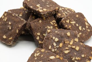 Das ist eine Leckerei aus Schoko-Buttermürbeteig mit 26 % Butter, 18 % Mandeln und lieblichen Gewürzen. Durch den geringen Zuckeranteil kommt der schokoladige Geschmack besonders zur Geltung.